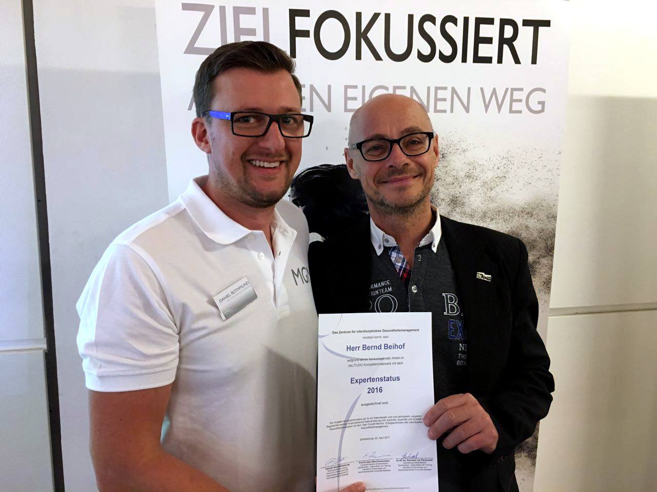 Bernd Beihof wird retrospektiv ausgezeichnet, mit dem Expertenstatus 2016 für die hervorragende Arbeit im Valitudo Kompetenznetzwerk. Begutachtet wurden: Anamnetische Datenerhebung und –kontrolle, Quantität und Qualität der Gesundheitsevaluation und Erfolgskontrollen des individuellen Gesundheitsmanagements. – mitDaniel Rothmund, Bernd Beihof und Injoy Weida.